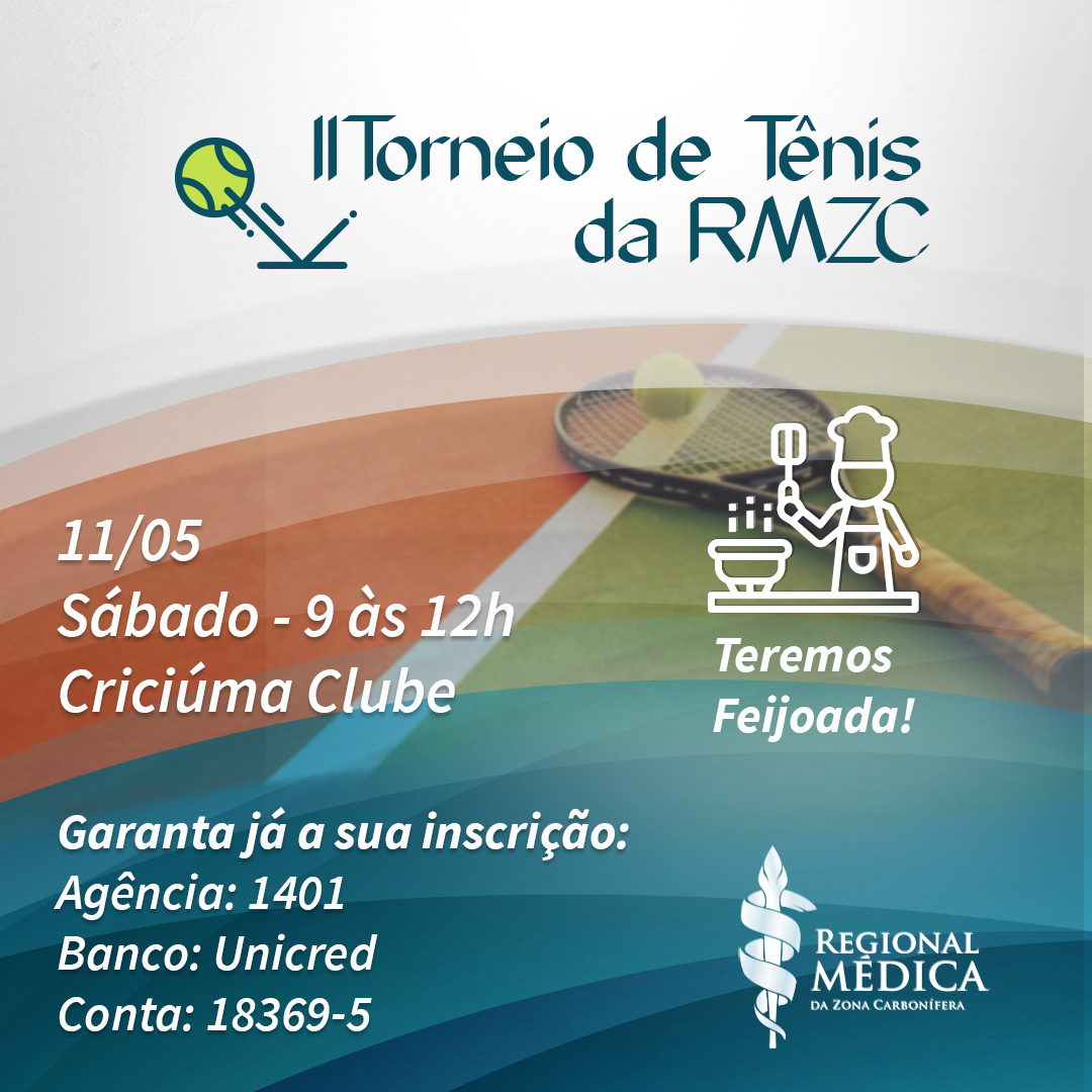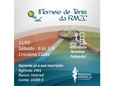 A Regional Médica da Zona Carbonífera (RMZC) promove no dia 11 de maio, o 2º Torneio de Tênis para os associados da RMZC. Com início às 9 horas, no Criciúma Clube, o evento terá feijoada no almoço. As inscrições custam R$ 60 por adulto, sendo que crianças até 11 anos não pagam.